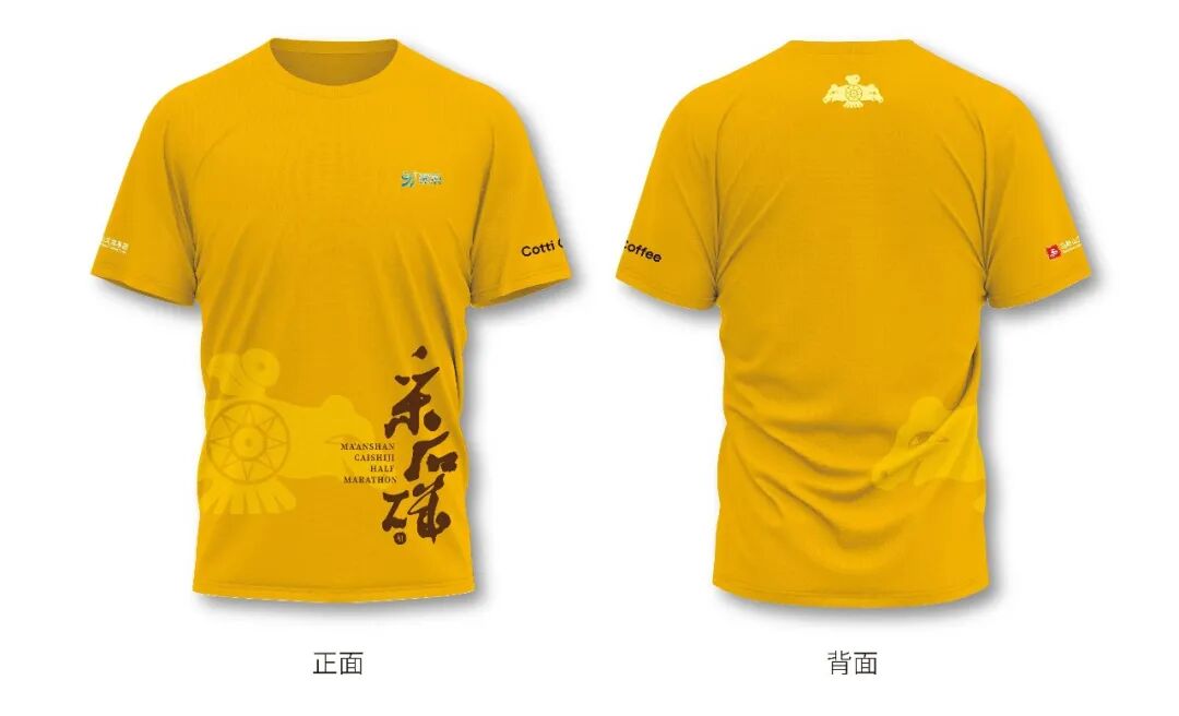 賽事服以黃色為主色調,傳遞活力與熱情。正面以凌家灘出土玉器之一——玉鷹為底紋,搭配采石磯元素與賽事名稱,彰顯地域文化交融;背面亦有玉鷹呼應。整體將凌家灘文化與馬拉松活力結合,既具運動時尚感,又承載深厚歷史底蘊,為跑者打造獨特參賽標識。