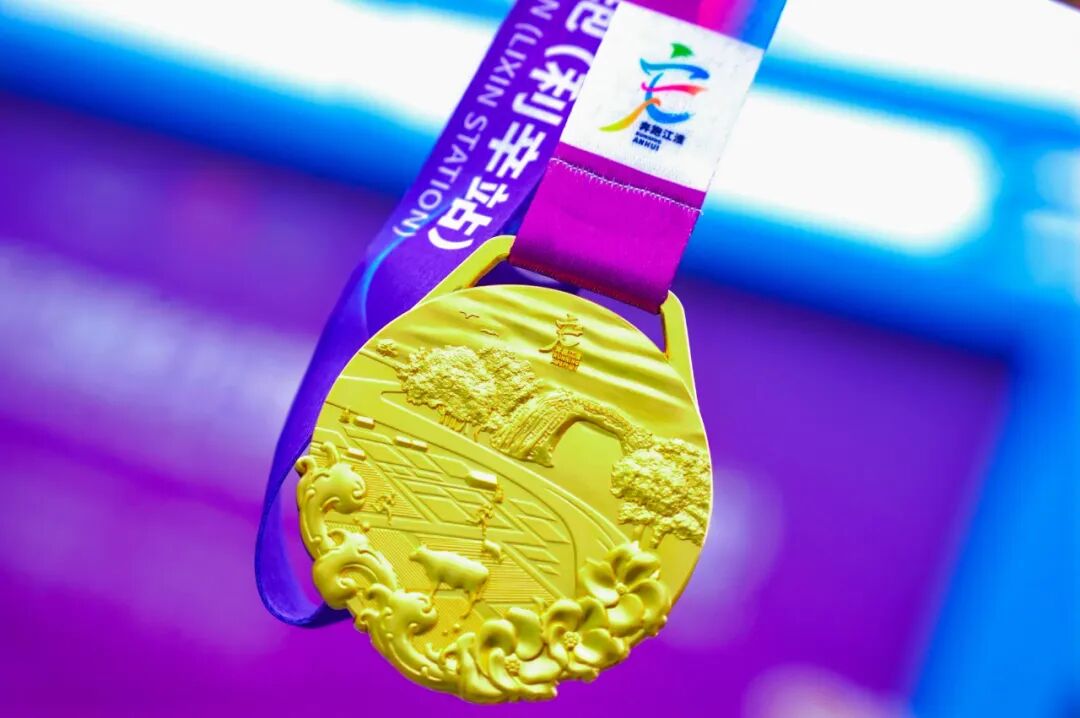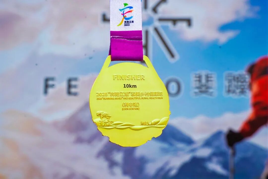 完賽獎牌以“西淝河國家濕地公園”為主題,匠心獨運。正面盛放的黃蜀葵寓意產業振興,融入稻田、水紋與黃牛耕影,展現生態與農耕的和諧共生。