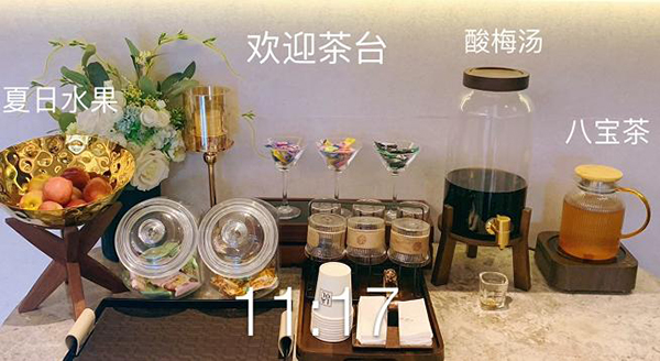 大堂吧歡迎茶臺(tái)常備酸梅湯、綠豆水等冰飲和時(shí)令水果。